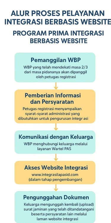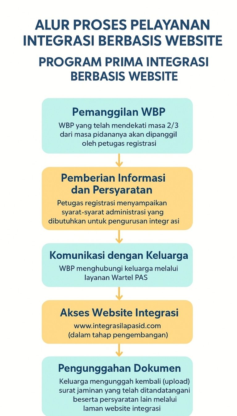 Layanan Integrasi online merupakan Layanan yang diberikan untuk mempermudah warga binaan pemasyarakatan dalam pengurusan program integrasi. Dimana layanan ini dapat menghemat waktu dan biaya serta mempermudah keluarga WBP untuk mendapatkan surat jaminan, silahkan pilih di menu Layanan. Keluarga WBP juga dapat langsung mengupload surat jaminan dan KTP penjamin ke website tanpa harus datang ke lapas, silahkan pilih menu Layanan. Untuk melihat nama-nama WBP yang sudah mendekati masa 2/3 masa pidana dan sudah bisa mengajukan integrasi silahkan pilih menu 2/3 WBP.