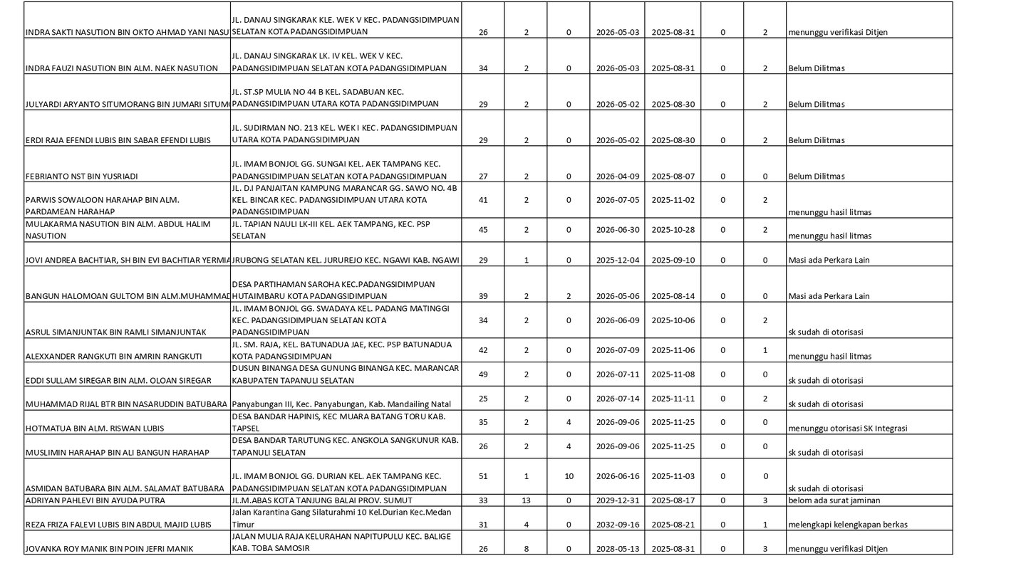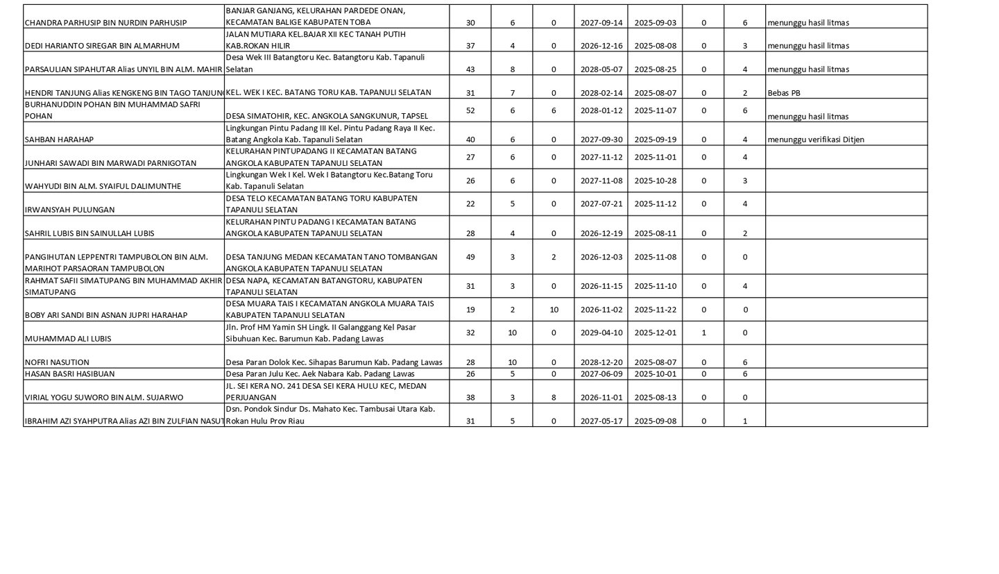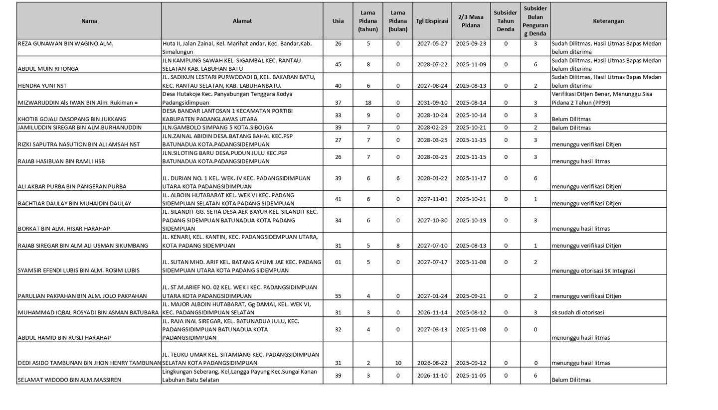Berikut adalah daftar nama-nama Warga Binaan Di Lapas Kelas IIB Padang Sidempuan yang telah mendekati 2/3 masa tahanan dan memenuhi syarat dalam pengurusan Program Integrasi